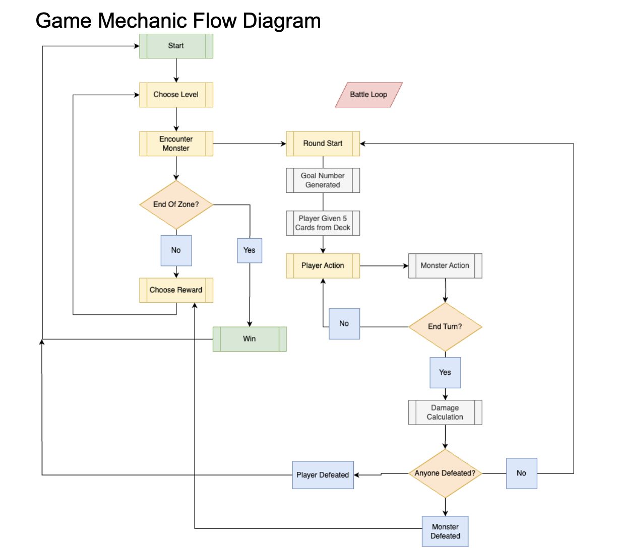 Taking inspiration from other number-heavy card games such as Slay The Spire and Balatro, I wanted my game to have that same satisfying feel when you calculate the exact path to victory in any given moment. Slay The Spire definitely had the heaviest influence on the systems, with the targeting and turn-based pattern. However, since the core mechanic was players operating their way to a certain goal number while the enemy does the same, the idea to split the game into turns and rounds, with unique distinctions between the two, came into light. This was so the balance of moves between the two sides was relatively similar, with a slight priority on the player’s round to give them an advantage. Additionally, having turns signify and change the goal number allowed the game to have a more layered combat system, scalable into future mechanics such as damage over time, or turn manipulation that I wanted to work into the game.