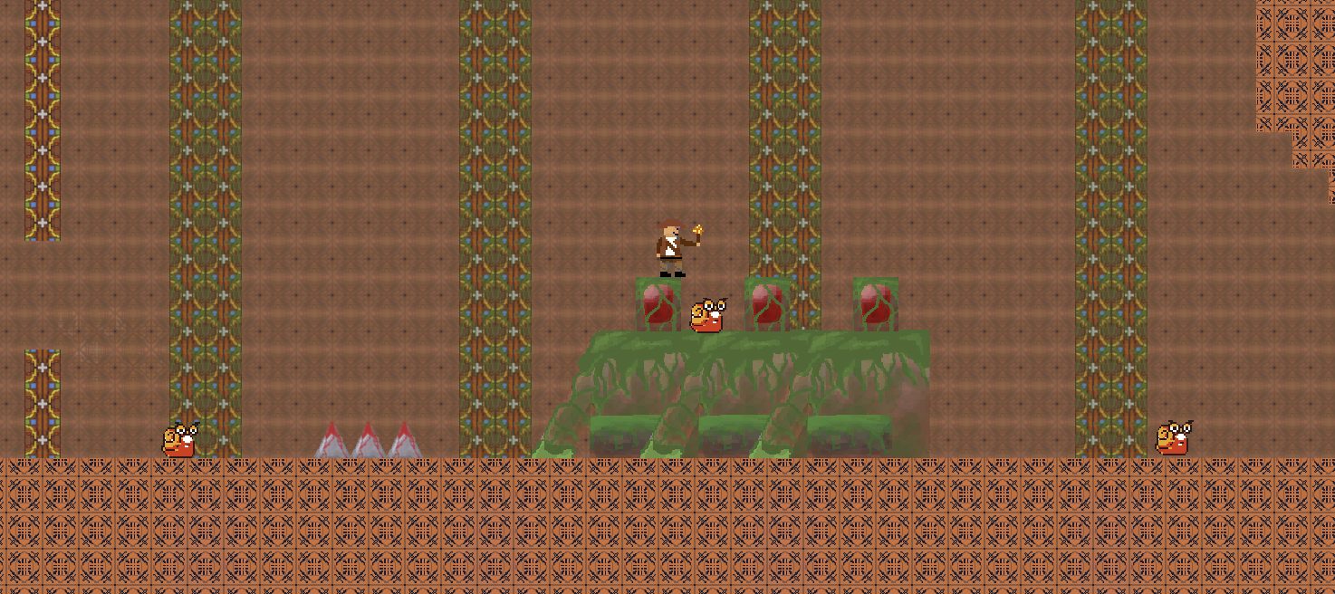 When designing the levels, I took into mind what each form offered. The human can kill snail enemies via stomping, the monkey can wall climb and double jump, the bird can glide, and the snake can fit into small spaces.