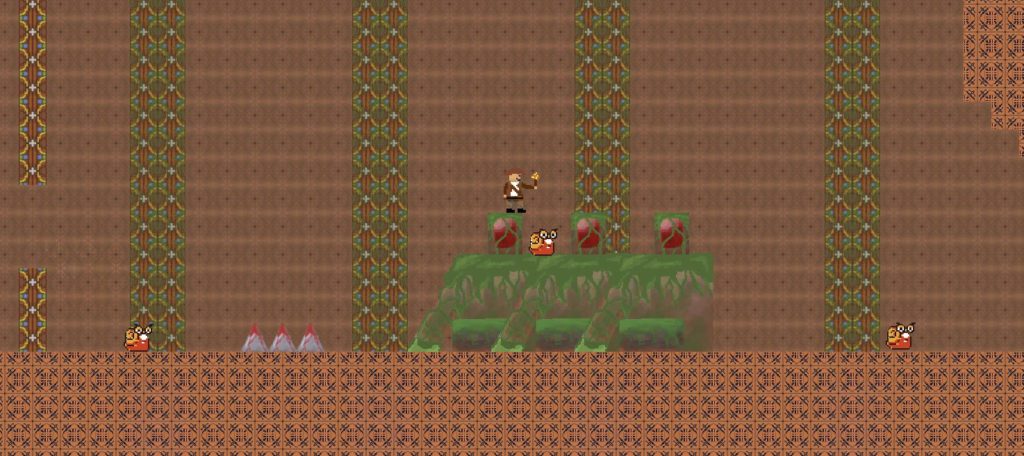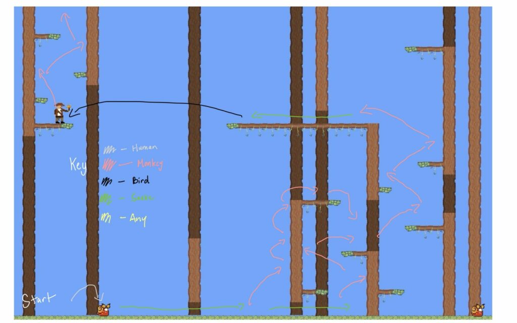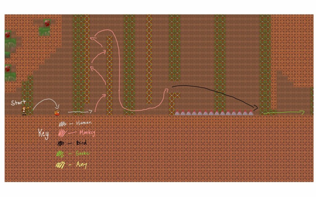 Creating the levels, I took into mind what each form offered. The human can kill snail enemies via stomping, the monkey can wall climb and double jump, the bird can glide, and the snake can fit into small spaces.