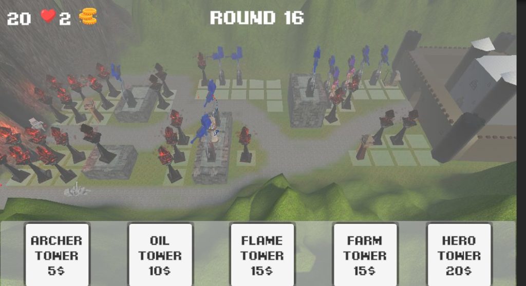 The game field (excluding the castle) was going to be pitch black to mimic the middle of the night. Players would have to buy torches and other lights to expand their vision. Towers would not be able to spot enemies not within the light’s reach.